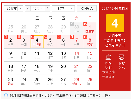 2017年中秋節(jié)是10月4日(星期三),故而與國(guó)慶節(jié)連休放假共8天(10月1日-10月8日)。9月30日(星期六)上班。