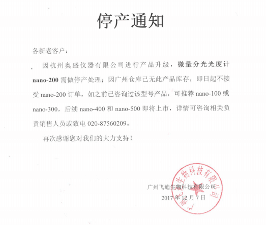 接杭州奧盛儀器有限公司通知,因產品升級換代,即日起對奧盛nano-200微量分光光度計做停產處理。