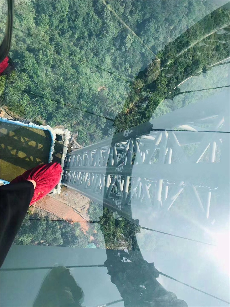 僅僅是漂流行程那還是不夠刺激的,同事們就出發(fā)玻璃棧道中的網(wǎng)紅大網(wǎng)球拍,行走玻璃棧道的樂趣,遠看倒是覺得還行,但是真實站在上面心中還是有一絲害怕,甚至腳都有點不聽使喚了。在玻璃橋底下也是可以清楚看見的山谷景觀,膽大的同事都在上面逛了好幾圈。充實的黃騰峽之旅就已經(jīng)結(jié)束。