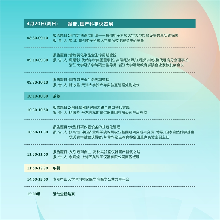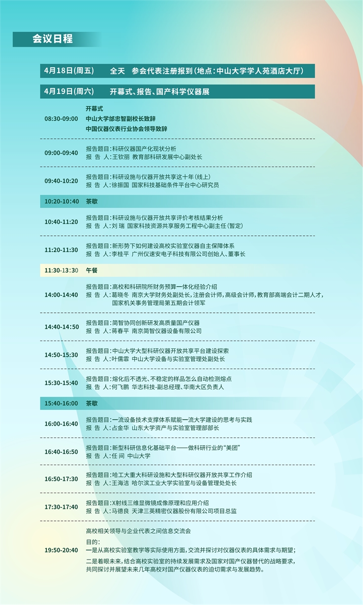 為深入貫徹習近平總書記提出的“要打好科技儀器設備、操作系統和基礎軟件國產化攻堅戰,鼓勵科研機構、高校同企業開展聯合攻關,提升國產化替代水平和應用規模,爭取早日實現用我國自主的研究平臺、儀器設備來解決重大基礎研究問題。”的指示要求,落實《國務院關于進一步深化預算管理制度改革的意見》(國發(2021)5號)、《國務院關于印發<推動大規模設備更新和消費品以舊換新行動方案>的通知》(國發(2024)7號)精神,加強儀器資源全生命周期管理,促進國產儀器在高等學校和科研院所的推廣應用,在國家科技資源共享服務工程技術研究中心指導下,中國儀器儀表行業協會與中山大學、北京中教中培教育科技中心等單位研究決定,于2025年4月18日-21日在深圳市舉辦“2025年大型科研儀器資產管理研討暨國產儀器進高校(中山大學站)活動”(以下簡稱活動)。