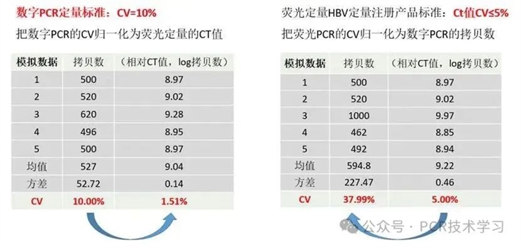 dPCR相比qPCR,具有高精度的定量檢測能力,dPCR的精度范圍一般是±10%(拷貝數),而qPCR的精度范圍一般是±5%(Ct值);經過單位歸一化之后,dPCR精度比qPCR高出約8倍。