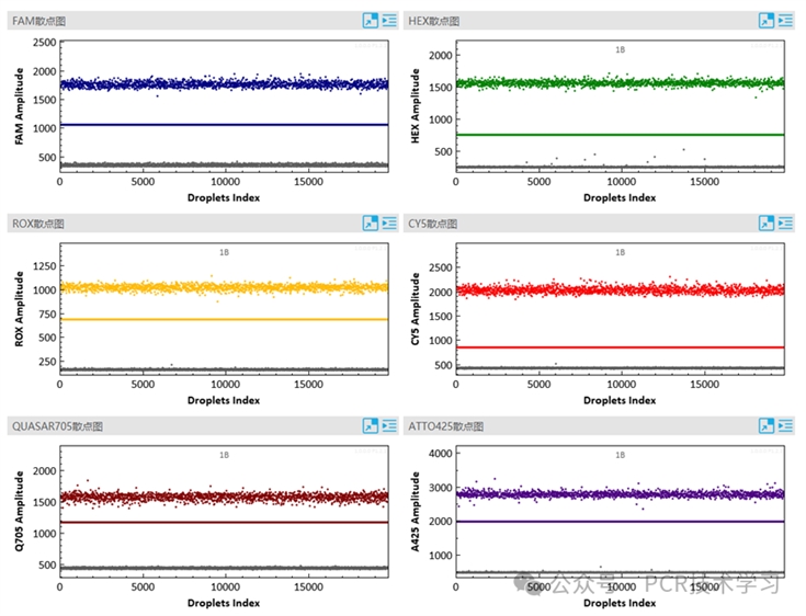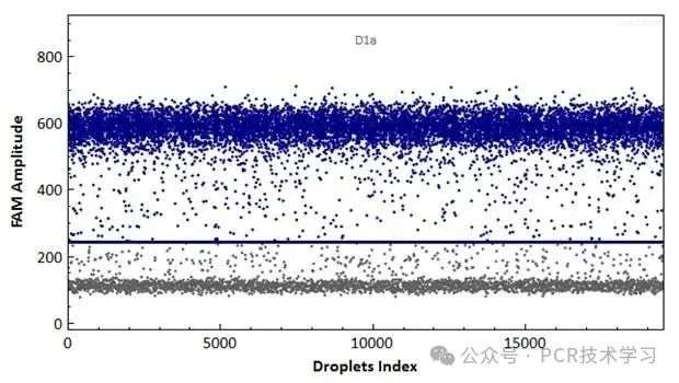 在一維散點圖中,每個液滴或腔室的熒光信號,都用一個點表示,橫坐標表示液滴的序號,縱坐標表示液滴的熒光強度值。通常情況下,如果1個或多個目標模板 DNA 分子存在于某個液滴中,并實現了PCR擴增時,就會產生熒光信號(基于探針或EvaGreen染料)。通常,一個有陽性模板樣本的結果,會在散點圖上看到兩個聚類的信號層,上面的聚類的是陽性(含有1個或多個分子),下面的聚類為陰性(不含分子)。系統軟件或用戶手動設置兩個聚類之間的閾值,以確定哪些液滴為陽性,哪些為陰性。然后使用泊松公式計算,以確定樣品中的分子數量。