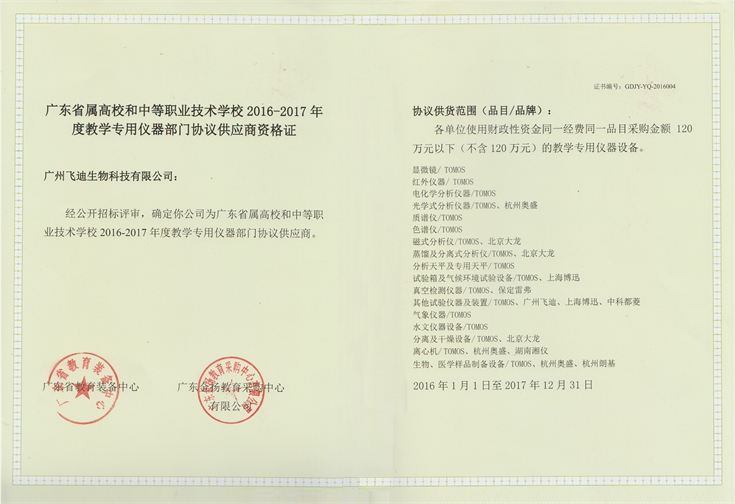 祝賀我司榮獲廣東省屬高校和中等職業技術學校2016-2017年度教學專用儀器部門協議供應商資格證!