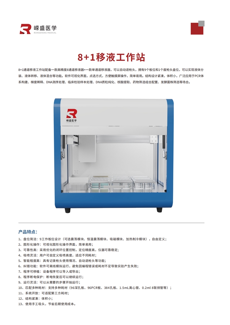 8+1通道移液工作站配備一款高精度8通道移液器+一款單通道移液器,可以自動退槍頭,擁有9個板位和1個廢槍頭盒位,可以實現液體分裝、液體轉移、液體混合等功能。軟件可視化界面,點選方式,方便觸摸屏操作,簡單易用。結構設計緊湊,體積小,廣泛應用于PCR體系構建、梯度稀釋、DNA測序處理、臨床檢驗樣本處理、DNA質粒純化、核酸提取、藥物篩選組合配置、發酵菌株篩選等場合。