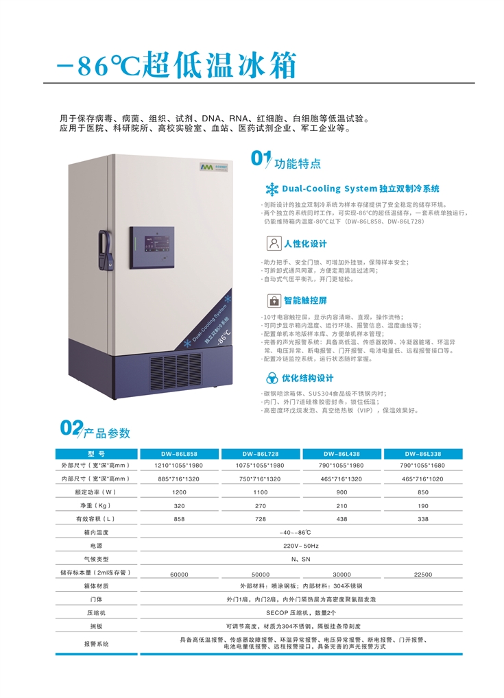 -86°C超低溫冰箱用于保存病毒、病菌、組織、試劑、DNA、RNA、紅細胞、自細胞等低溫試驗等。 應用于醫(yī)院、科研院所、高校實驗室、血站、醫(yī)藥試劑企業(yè)、軍工企業(yè)等。