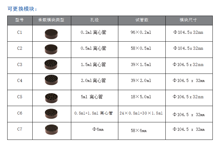 ◆ 多種圓形模塊選擇,可以互換,便于清潔與消毒使用各種試管。