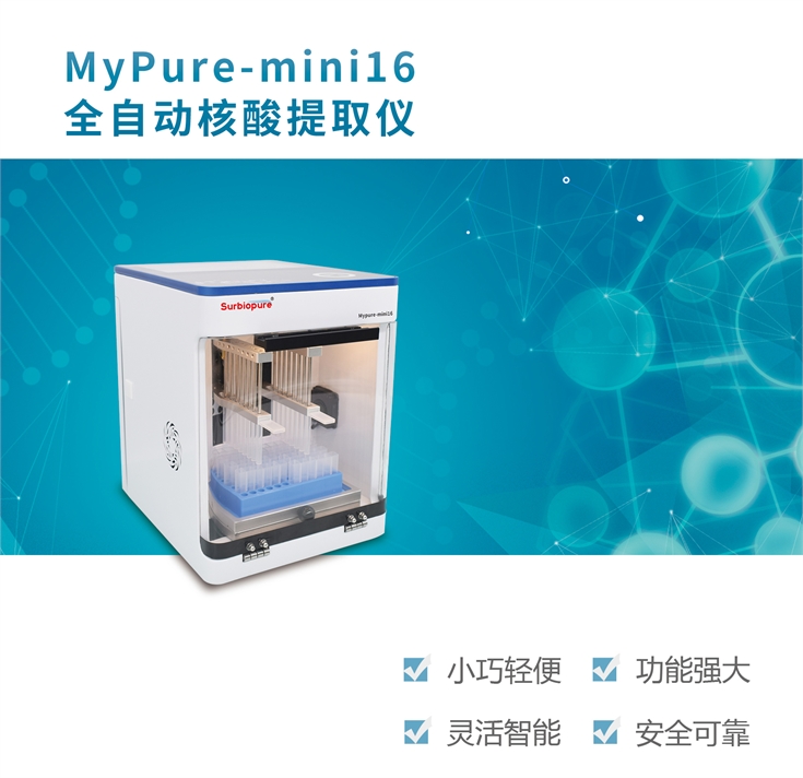 MyPure-Mini16全自動核酸提取儀采用磁珠分離技術,利用2.2ml深孔板、2.2ml試劑條、8聯磁棒套;搭配不同種類的磁珠法核酸提取試劑盒,最多可一次同時操作1-16個樣本,儀需9~45分鐘就可快速提取樣本中的DNA和RNA。 本系統通量靈活,可實現不同需求量的樣品提取,使用范圍廣;每次可同時提取1-16個樣品,配合單條試劑可實現1-8個樣品的任意通量同時提取;搭載7寸彩色觸控一體化操作界面,可自由編輯提取程序;配置負壓排氣系統和紫外燈消毒系統,避免氣溶膠污染,安全可靠;尤其適合零散樣本的現場核酸提取,配合實時熒光定量PCR系統,可輕松實現戶外現場樣本的即時檢測。